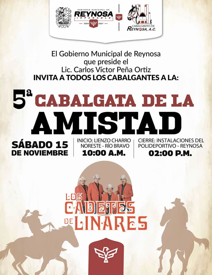 El Gobierno Municipal de Reynosa, que encabeza el Alcalde Carlos Peña Ortiz, invita a todas y todos los cabalgantes a la Quinta Edición de la Cabalgata de la Amistad, celebrando la tradición y el orgullo del Norte de Tamaulipas.