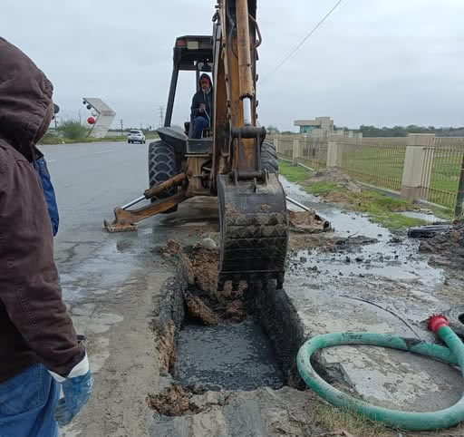 La Comisión Municipal de Agua Potable y Alcantarillado de Reynosa lleva a cabo la reparación de una fuga de agua residual proveniente del emisor del Cárcamo 14, sobre la Carretera Reynosa–Río Bravo, con el objetivo de atender de manera oportuna la situación y evitar mayores afectaciones en la zona.