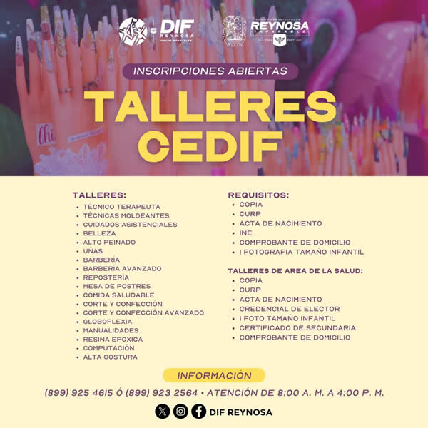 De esta forma, el DIF-Reynosa acerca herramientas de capacitación accesibles que permitan a los ciudadanos fortalecer su preparación, mejorar su calidad de vida y contribuir al bienestar de sus familias: para más información marcar al teléfono 8999254615 a partir del 7 de enero.