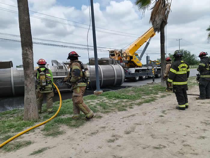 Al momento, elementos del Heroico Cuerpo de Bomberos se encuentran trabajando en la atención de una volcadura de tractocamión de articulación doble, registrada en el bulevar Miguel Hidalgo con libramiento a Monterrey, donde el paso fue cerrado, sobre y bajo el puente.