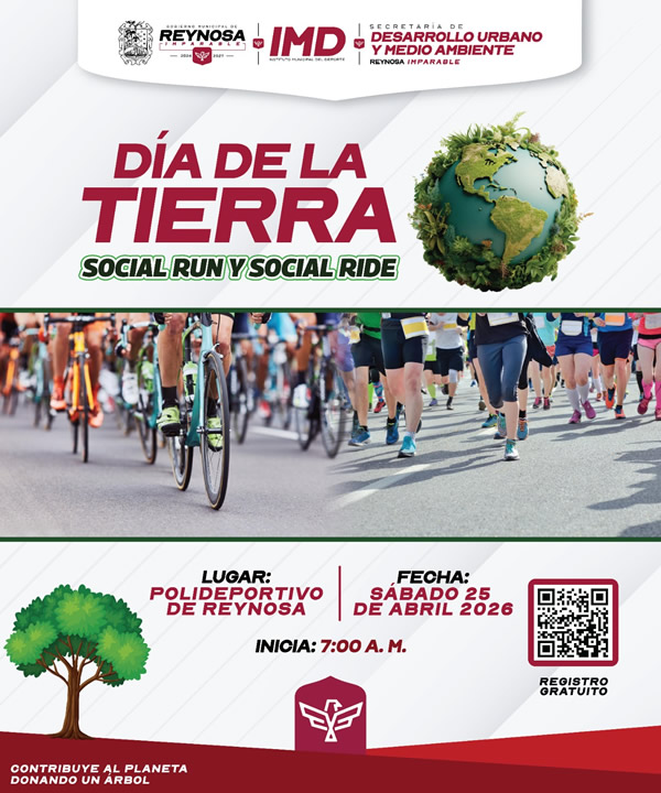 El Alcalde Carlos Peña Ortiz, te convoca a formar parte de la conmemoración del Día de la Tierra, Social Run y Social Ride con una Carrera 5K y una Rodada Ciclista, este sábado 25 de abril, asiste al malecón de la laguna La Escondida, a un costado del Polideportivo Reynosa a partir de las 7:00 de la mañana.