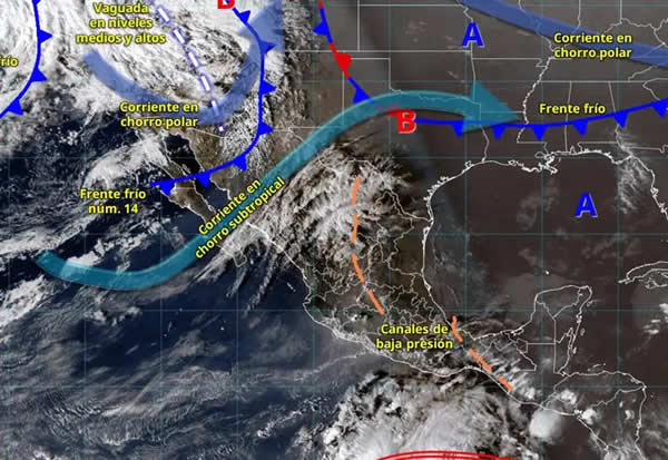 Se prevé la llegada de otro frente frío se aproxime rápidamente al noroeste mexicano y, asociado con una circulación ciclónica en niveles medios y altos de la atmósfera y con las corrientes en chorro polar y subtropical, originará lluvias y chubascos, descenso de temperatura y vientos fuertes, pronosticándose lluvias puntuales fuertes en Baja California (norte), con posibles nevadas en las sierras y norte de Sonora.