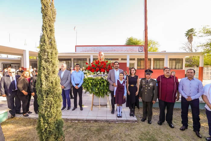 Conmemorando el Aniversario del Natalicio de Don Benito Juárez, el Alcalde Carlos Peña Ortiz presidió la ceremonia llevada a cabo con la participación de la Diputada Federal Claudia Alejandra Hernández Sáenz; Coronel de Caballería Marco Antonio de la Fuente Barragán, comandante del Décimo Noveno Regimiento de Caballería Motorizado; Juan Carlos Zertuche Romero, Diputado Local y el Director de la escuela primaria Benito Juárez, Emmanuel Martínez Hernández.