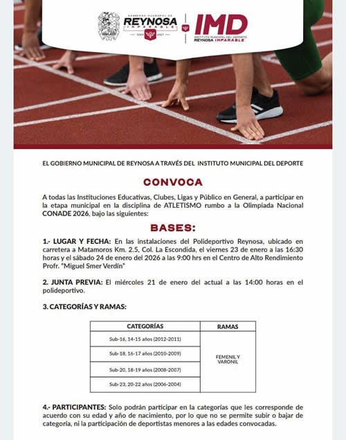El Gobierno Municipal invita a las y los deportistas del municipio a participar en la disciplina de Atletismo la cual será válida como proceso selectivo rumbo al Nacional CONADE.
