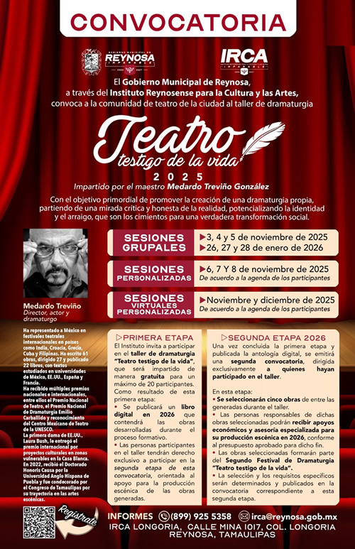 El Gobierno de Reynosa, que preside el Alcalde Carlos Peña Ortiz, invita a creadores teatrales a participar en el Taller gratuito “Teatro, testigo de la vida” 2025, impartido por el Maestro tamaulipeco Medardo Treviño González. El Taller busca fomentar una dramaturgia crítica y honesta, fortaleciendo la identidad y el arraigo como base para la transformación social. Las obras creadas serán reunidas en una antología digital que se publicará en 2026. Quienes participen podrán acceder a una segunda etapa, donde se seleccionarán cinco obras para recibir apoyo económico y asesoría especializada para su producción escénica, mismas que se presentarán en el Segundo Festival de Dramaturgia. El registro está disponible en línea en el enlace https://forms.gle/oNiRnvUVhQ5AX4136. Para mayores informes comunicarse al Instituto Reynosense para la Cultura y las Artes al teléfono 8999255358