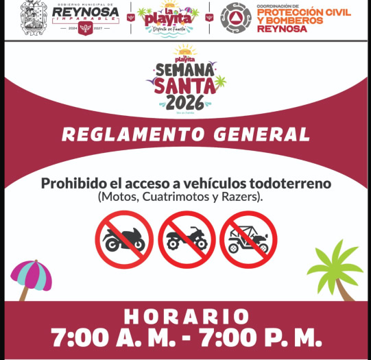 * Para ofrecer un buen nivel de seguridad a las familias que visitan La Playita de Reynosa, el Gobierno Municipal restringió la entrada de vehículos todo terreno, motos, cuatrimotos y razers no pueden ingresar al centro recreativo. No se permite introducir envases de vidrio ni el uso de cualquier tipo de estupefacientes, como tampoco utilizar el río como balneario, cumplir las reglas del lugar permitirá una sana convivencia entre más familias asistentes. #ReynosaImparable #GobiernoMunicipalDeReynosa