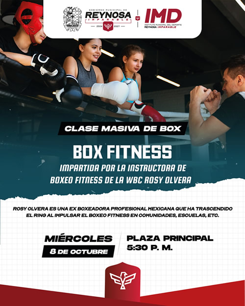 ¡Guantes al frente, disfruta y aprende! El Presidente Municipal Carlos Peña Ortiz te invita a participar en la Clase Masiva de Box Fitness con la instructora de la WBC, Rosy Olvera, hoy miércoles 8 de octubre a las 5:30 de la tarde en la plaza principal Miguel Hidalgo de Reynosa.