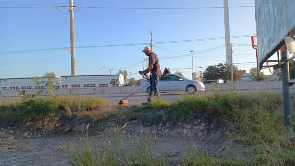 Libramiento Monterrey, entrada al Parque Industrial del Norte, se avanza en el corte de maleza para mantener la zona libre de obstáculos y mejorar la visibilidad en la entrada al complejo.