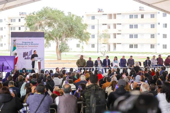 “Me da mucho gusto estar hoy aquí en Reynosa, Tamaulipas, para entregar beneficios de los programas del Gobierno de la República. Agradezco la presencia del Gobernador Constitucional de Tamaulipas, Doctor Américo Villarreal Anaya, y del Presidente Municipal de Reynosa, Carlos Peña Ortiz”, dijo la Presidenta al encabezar la entrega de beneficios de programas federales, de Vivienda del Bienestar y Pensión para Mujeres Bienestar.