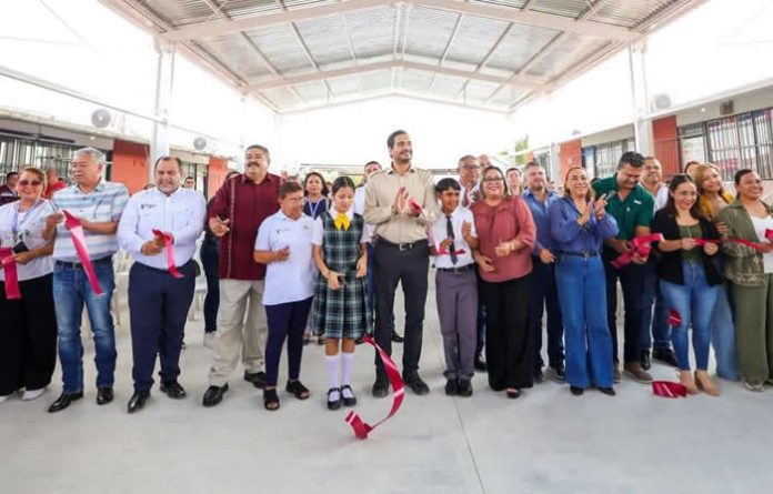 Inaugurando la Techumbre Metálica en la escuela primaria Aquiles Serdán, de la colonia Rancho Grande, el Presidente Municipal Carlos Peña Ortiz, fue recibido por la Directora Wendy Roxana Castro Lores y los alumnos Briana Camila González Cruz y David Alarcón Rincón.