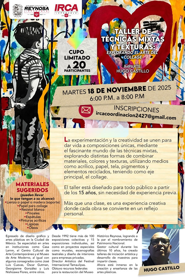 Por instrucciones del Alcalde Carlos Peña Ortiz, el Instituto Reynosense para la Cultura y las Artes convoca al Taller de Técnicas Mixtas y Texturas “Explorando el Arte del Collage”, impartido por el artista Hugo Castillo.