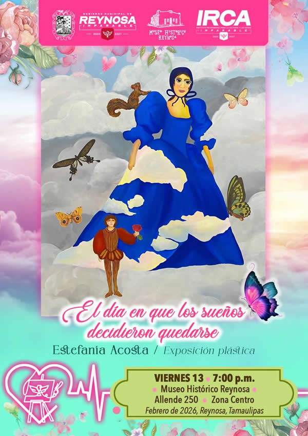 * El Gobierno de Reynosa, que preside el Alcalde Carlos Peña Ortiz, invita a la inauguración de la exposición pictórica “El día en que los sueños decidieron quedarse”, de la artista Estefanía Acosta Franco, este próximo viernes 13 de febrero a las 19:00 horas en el Museo Histórico Reynosa. A través de un estilo naíf, la pintora presenta una obra cargada de simbolismos donde lo cotidiano se transforma en extraordinario. En sus lienzos, crea un puente entre la realidad y los sueños. La propuesta visual de Acosta Franco es una narrativa sensible y honesta que invita al espectador a una “realidad mágica”. Con esta exposición, la artista recuerda que la fantasía es una forma legítima de habitar el mundo, y resalta la nostalgia, el asombro y la infinita capacidad de soñar. #ReynosaImparable #Reynosa #Tamaulipas