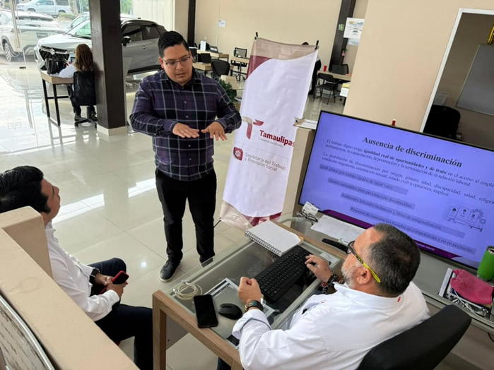 Ciudad Victoria, Tamaulipas.- Como parte de las acciones permanentes para fortalecer entornos laborales justos y respetuosos, la Secretaría del Trabajo y Previsión Social de Tamaulipas (STPS) llevó a cabo la Sesión Informativa “Trabajo Digno”, dirigida a gerentes de la Agencia Automotriz Suzuki, en el municipio de Ciudad Victoria.