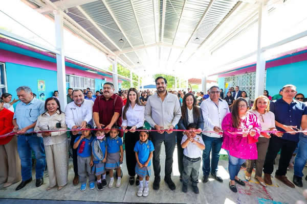 Una Techumbre Metálica de 296 metros cuadrados, del Programa de Obra Pública Más Grande en la Historia de Reynosa, inauguró el Alcalde Carlos Peña Ortiz para beneficio de más de 500 alumnos del jardín de niños Juan B. Tijerina Villarreal, de Villa Florida, a donde acudió acompañado por su esposa Alejandra Yelitza Garza, Presidenta del Voluntariado DIF-Reynosa.