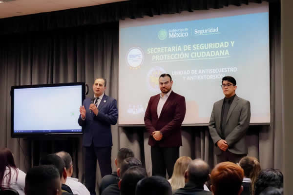 La capacitación es impartida por el oficial Miguel Ángel Alarcón Hernández, adscrito a la Unidad de Antisecuestro y Antiextorsión de la Secretaría de Seguridad y Protección Ciudadana (SSPC) y el agente investigador Carlos Roberto Medina Palma, quienes compartieron conocimientos especializados para fortalecer la capacidad operativa identificando las diversas modalidades de extorsión y de respuesta ante situaciones de crisis generadas por el delito de extorsión.