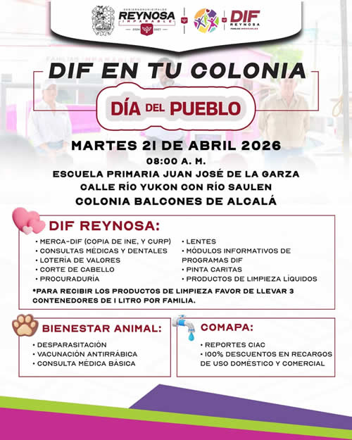 El Sistema DIF-Reynosa que encabeza Carlos Luis Peña Garza, invita a las familias a participar en la brigada “DIF en Tu Colonia”, que se realizará el próximo martes 21 de abril a partir de las 08:00 de la mañana, en la Escuela Primaria “Juan José de la Garza”, ubicada en la colonia Balcones de Alcalá.