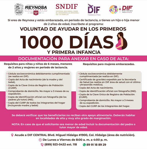 El Sistema DIF-Reynosa que preside Carlos Luis Peña Garza, hace un llamado a mujeres embarazadas y a familias con niñas y niños de 0 a 2 años de edad a formar parte del programa “Voluntad de ayudar en los primeros 1000 días”, enfocado en fortalecer la nutrición y el desarrollo durante esta etapa fundamental de la vida.