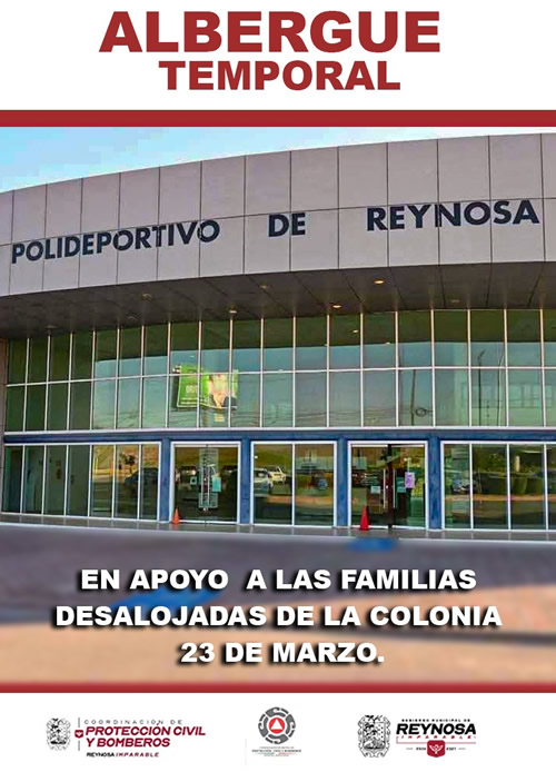 Por indicaciones del Presidente Municipal Carlos Peña Ortiz, la Coordinación de Protección Civil y Bomberos habilitó como Albergue Emergente el Polideportivo Reynosa, para las familias que fueron desalojadas de la colonia 23 de Marzo.