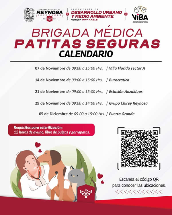 El Presidente Municipal Carlos Peña Ortiz sigue invitando a las familias reynosenses a tener mascotas sanas haciendo uso gratuito de los servicios que lleva a las colonias la brigada médica veterinaria Patitas Seguras, que este viernes 7 de noviembre visitará Villa Florida sector A.