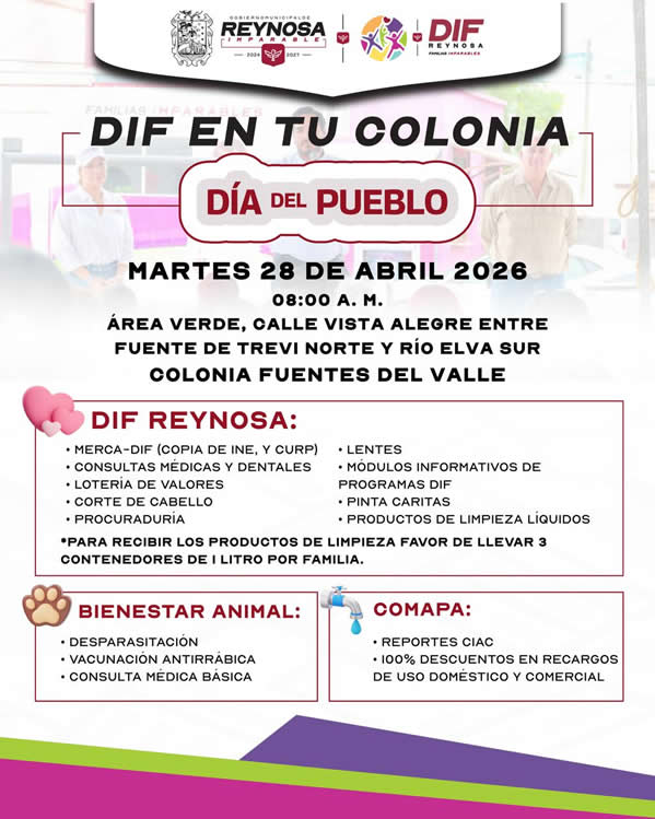Con el objetivo de acercar apoyos y atención directa a las familias, el Sistema DIF-Reynosa que preside Carlos Luis Peña Garza, realizará la brigada “DIF en Tu Colonia” este martes 28 de abril en la colonia Fuentes del Valle, donde se ofrecerán diversos servicios de manera gratuita.