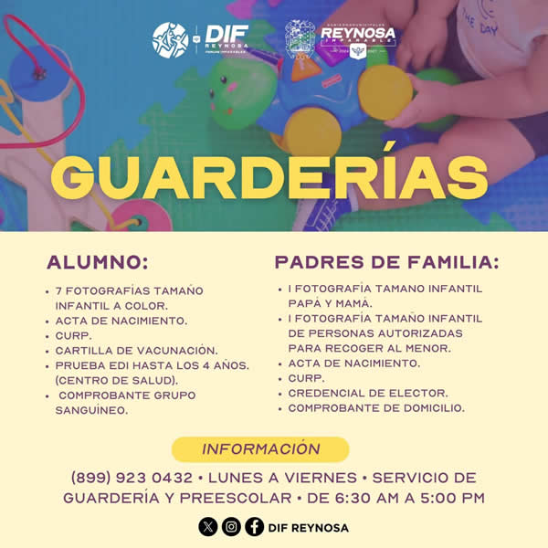 El Sistema DIF-Reynosa que preside Carlos Luis Peña Garza, continúa con las inscripciones abiertas en las guarderías, donde se brinda atención, protección y un entorno adecuado que favorece el desarrollo integral de niñas y niños, ofreciendo a las familias una opción para el cuidado de sus hijos mientras trabajan o estudian.