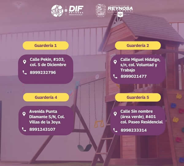Las guarderías DIF se ubican en distintos sectores de la ciudad para facilitar el acceso a las familias: Guardería 1 en la colonia 5 de Diciembre, Guardería 2, en Voluntad y Trabajo, Guardería 4, en colonia Villas de la Joya y Guardería 5, en la colonia Paseo Residencial.