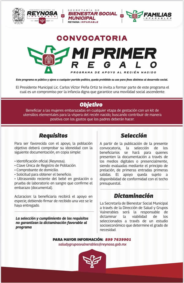 El Alcalde Carlos Peña Ortiz invita a las mujeres embarazadas que residan en Reynosa, a inscribirse al programa municipal “Mi Primer Regalo”, y puedan recibir el beneficio social mediante el cumplimiento de sencillos requisitos.