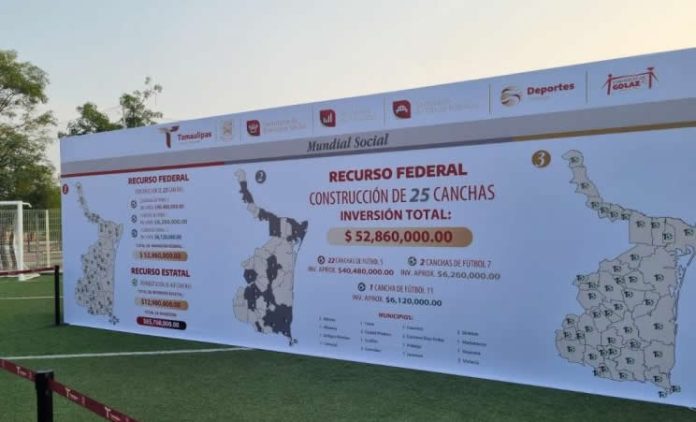 En el marco de la ceremonia de Honores a la Bandera realizada el lunes y que encabeza el gobernador del estado Américo Villarreal Anaya, la titular de SEBIEN, destacó que gracias a la gestión del Ejecutivo estatal serán invertidos 52 millones 860 mil pesos de recurso federal en la construcción de 26 canchas de futbol en 17 municipios, además, con recursos propios por el orden de los 12 millones 900 mil pesos, se realizará la rehabilitación de 43 canchas, lo que significa una inversión de hasta 300 mil pesos por municipio.