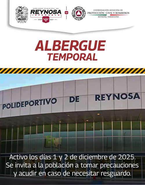 El Presidente Municipal Carlos Peña Ortiz habilitó el Albergue Temporal del Polideportivo Reynosa, con la finalidad de brindar, durante los días 1 y 2 de diciembre, protección cálida a personas sin hogar o en condición vulnerable ante las temperaturas que prevalecen en la ciudad.