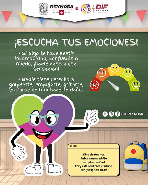 El Sistema DIF-Reynosa que preside Carlos Luis Peña Garza, impulsa la campaña de prevención y cuidado de la niñez a través de “Cory”, que hace un llamado a niñas y niños a reconocer la importancia de sus emociones y a expresarlas, como parte fundamental de su bienestar y desarrollo integral.