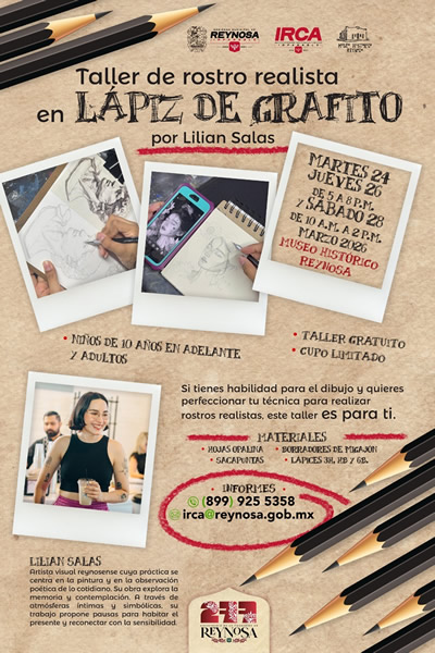 El Gobierno de Reynosa, que preside el Alcalde Carlos Peña Ortiz, invita a niños, jóvenes y adultos a inscribirse al Taller de Rostro Realista en Lápiz de Grafito, que será impartido por la artista Lilian Salas en el Museo Histórico Reynosa.