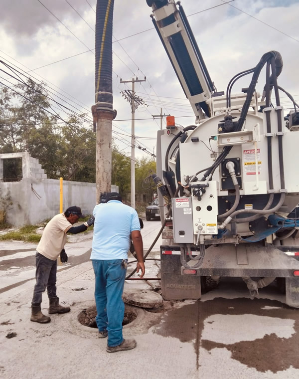 La Comisión Municipal de Agua Potable y Alcantarillado de Reynosa llevó a cabo trabajos de limpieza de pozos y sondeo de la línea general de drenaje sanitario en la colonia Marte R. Gómez, a fin de mantener bajos los niveles en la red y prevenir afectaciones en el sector.