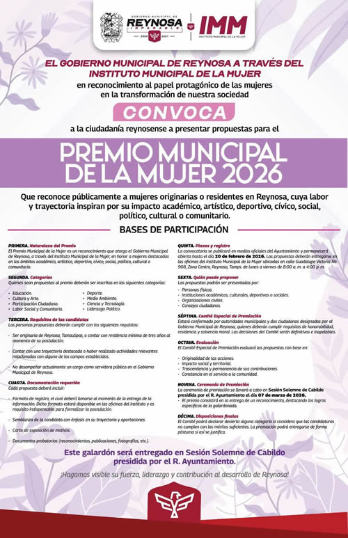 Las Bases están disponibles en la Convocatoria que cierra el 20 de febrero y la ganadora recibirá el galardón en Sesión Solemne de Cabildo del Ayuntamiento de Reynosa el próximo 7 de marzo del 2026, quien recibirá un reconocimiento que destaca sus logros de acuerdo a la evaluación y decisión del Comité Especial de Premiación.