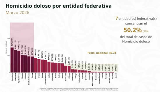 A nivel nacional, más del 50% de homicidios dolosos se concentran en siete estados del país, con un total de 799 casos: Guanajuato, Chihuahua, Baja California, Morelos, Guerrero, Estado de México y Oaxaca, de acuerdo con los datos presentados en la conferencia matutina del 14 de abril de la presidenta Claudia Sheinbaum.