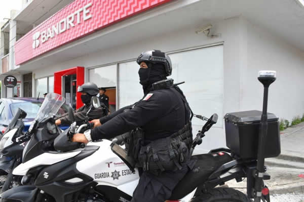 Ciudad Victoria, Tamaulipas.- Con el objetivo de salvaguardar la integridad y patrimonio de las y los tamaulipecos, personal de la Guardia Estatal mantiene la presencia y vigilancia en bancos, cajeros, y otras instituciones financieras ante el pago de aguinaldos y otras prestaciones.