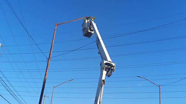 Los trabajadores, con apoyo de canastillas, sustituyeron lámparas Led que no funcionaban y reconectaron otras en buen estado para lograr la iluminación de toda la calle que es paso importante para varias colonias.