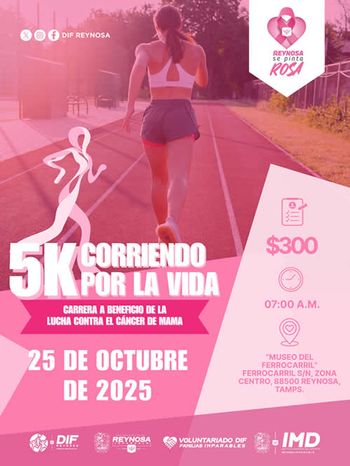 Cada paso cuenta cuando se corre por una causa que salva vidas, por lo que el Sistema DIF-Reynosa, que preside Carlos Luis Peña Garza y el Voluntariado que encabeza Alejandra Yelitza Garza, en coordinación con el Instituto Municipal del Deporte, invitan a la ciudadanía a participar en la Carrera 5K “Corriendo por la Vida”, que se llevará a cabo este próximo sábado 25 de octubre, a las 7:00 de la mañana, con punto de partida en el Museo del Ferrocarril, ubicado en la zona centro de Reynosa.