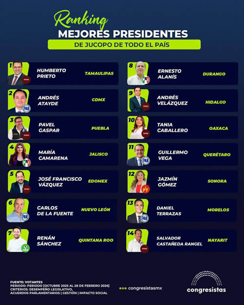 La evaluación reconoce en Humberto Prieto Herrera su capacidad de generar acuerdos parlamentarios y fortalecer la gestión territorial, impulsando un impacto social positivo con resultados tangibles, hasta confirmarlo en el primer lugar como el líder camaral local mejor evaluado entre los 32 estados del país.