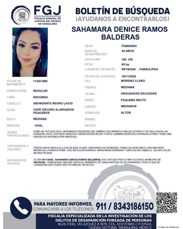 El colectivo Amor por los Desaparecidos, a través de sus redes sociales, reveló la desaparición de Sahamara Denise Ramos Balderas, de 45 años de edad, se registró la noche del martes 18 de noviembre en la colonia La Presa, en dicho municipio fronterizo.