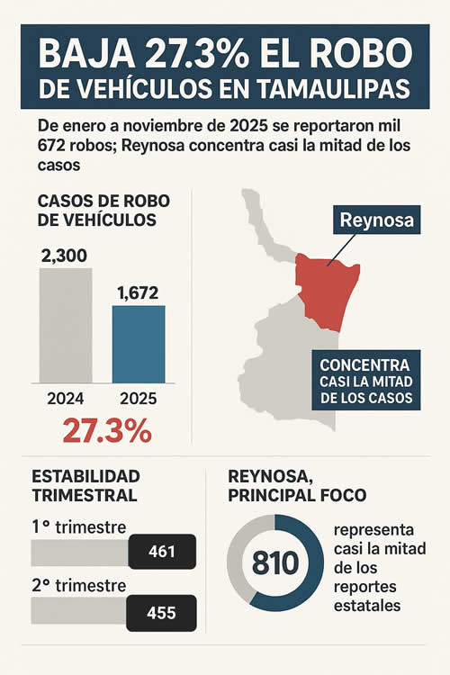 *De enero a noviembre de 2025 se reportaron mil 672 robos en Tamaulipas, baja 27.3%; Reynosa concentra casi la mitad de los casos.
