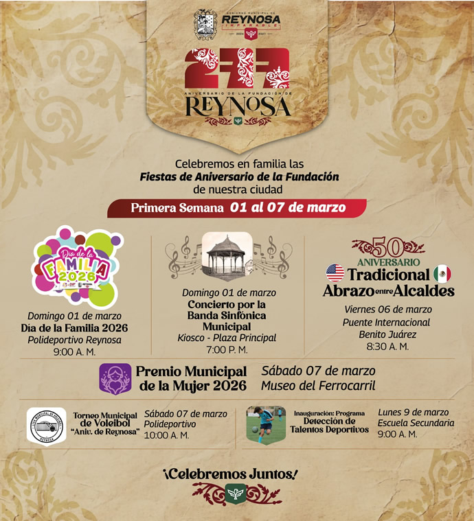 El Presidente Municipal Carlos Peña Ortiz invita a las familias locales, de la región y del Valle del Sur de Texas a disfrutar los festejos del 277 Aniversario de la Fundación de Reynosa, celebremos del 1 al 21 de marzo esta gran fiesta.
